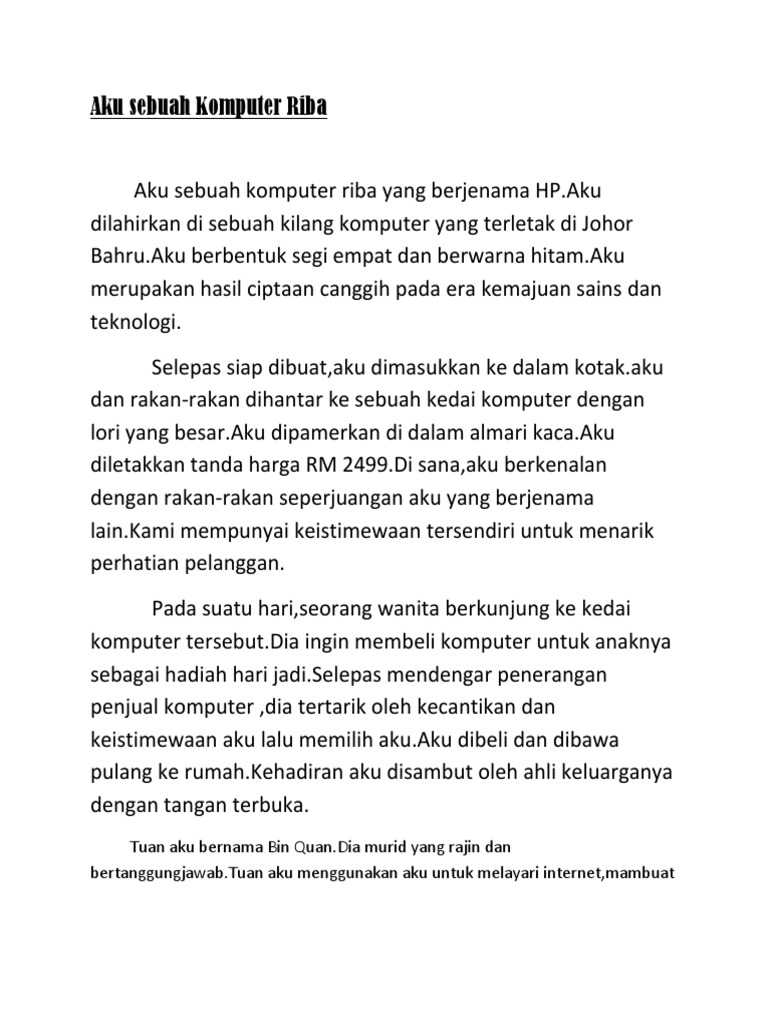 Aku diperbuat daripada gabungan plastik dan alumunium.aku berbentuk segi empat dan warnaku hitam. Yang ketat dan teliti sebelum dipasarkan. Aku juga mempunyai beberapa kawan seperti samsung, hp, apple, dell, dan sebagainya.harga aku adalah rm 2500.00. Karangan pendek aku sebuah komputer riba. May 04, 2012 · aku sebuah komputer riba yang berjenama hp.aku dilahirkan di sebuah kilang komputer yang terletak di johor bahru.aku berbentuk segi empat dan berwarna hitam.aku merupakan hasil ciptaan canggih pada era kemajuan sains dan teknologi. Jan 31, 2014 · aku adalah sebuah komputer riba yang berjenama lenovo. A short summary of this paper. Aku diperbuat dan dipasang di jepun dengan menggunakan plastik, aluminium dan besi. Aku sebuah komputer riba berjenama asus. Warna tubuh aku hitam dan perak. The copyright of the image is owned by the owner, this website only displays a few snippets of several keywords that are put together in a post summary. Karangan aku sebuah komputer riba. Pada suatu hari, seorang gadis yang cantik telah datang ke kedai tersebut.