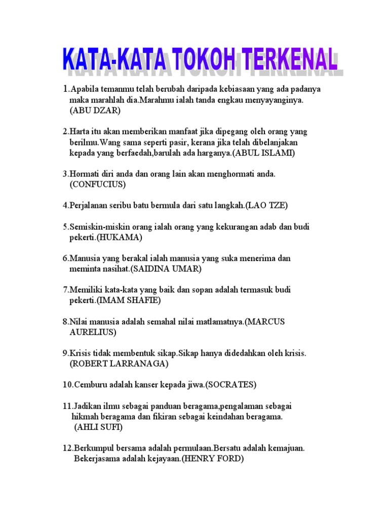 Kata Kata Tokoh Malaysia / KATA KATA MOTIVASI TOKOH DUNIA - YouTube - Saya mencintai kehidupan, tetapi saya tidak takut akan kematian.. Adapun artikel kata kata motivasi berikut ini yang dibuat untuk membangkitkan semangat agar bisa kembali menata kehidupan. Sukses adalah berjalan dari satu kegagalan ke kegagalan yang lain, tanpa kita kehilangan semangat. Setelah memberikan kompilasi kata kata mutiara dan juga kata kata bijak serta kata kata cinta umum dengan anonymous author, berikut ini anda bisa kata mutiara bijak cinta tokoh dunia. Kata kata mutiara singkat dan pendek itu bisa datang dari mana saja dan kapan saja, bisa dari orang lain atau dari diri sendiri. Malam adalah ketika cahaya memudar, namun segalanya justru menjadi hidup.